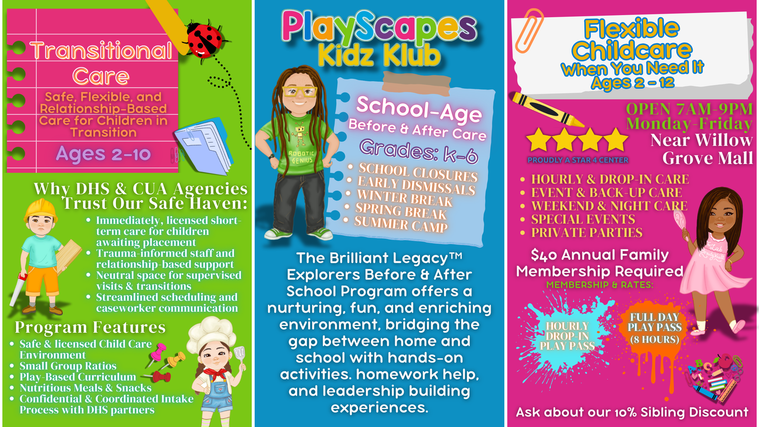PlayScapes Kidz Klub™ offers a wide range of programs designed to meet the needs of modern families. Our flexible Hourly Drop-In Care allows you to come when you need us with no long-term commitment, while our Event Child Care brings safe, on-site supervision to weddings, conferences, church services, and more. We provide Emergency and Back-Up Care for unexpected schedule changes, along with enriching early learning through our Legacy Learners program for older toddlers and preschoolers. School-age children thrive in our Brilliant Legacy Explorers before and after school program, which blends empowerment with academic support. We’re also here when school is closed with fun, themed Holiday Camps, and we make evenings and weekends possible with extended-hour care for date nights and shift workers. For celebrations, families can enjoy our customizable Private Children’s Parties featuring playtime, crafts, and included meal options.